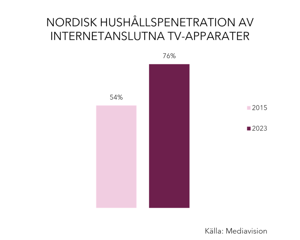70 procent av hushållen i Norden har idag en betald streamingtjänst. Under en tid har detta även ökat efterfrågan på TV-apparater med internetanslutning. Hela 75 procent av hushållen i Norden har idag åtminstone en TV-apparat med internetanslutning (CTV). Detta kan vara antingen via externa enheter som Apple TV, Google Chromecast etc., eller integrerat i själva TV-apparaten. Generellt sett har övergången till streaming ökat efterfrågan på dessa produkter.