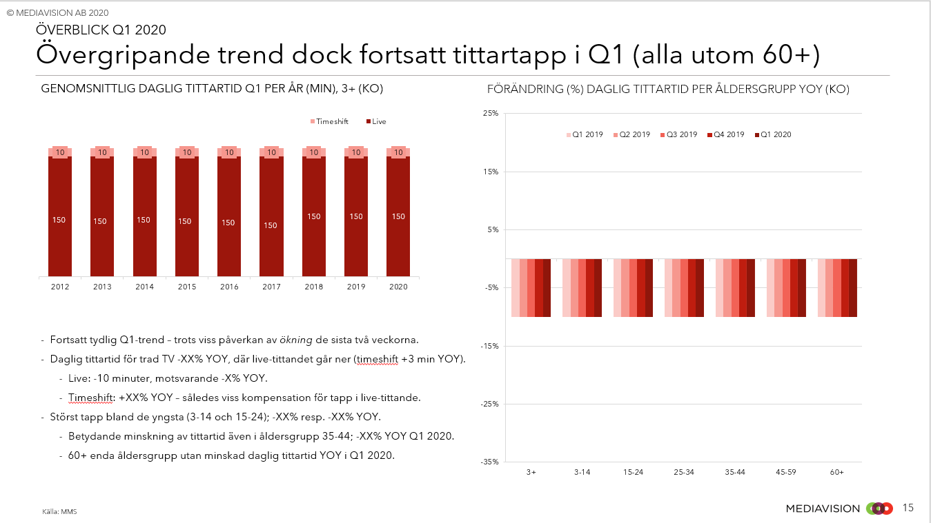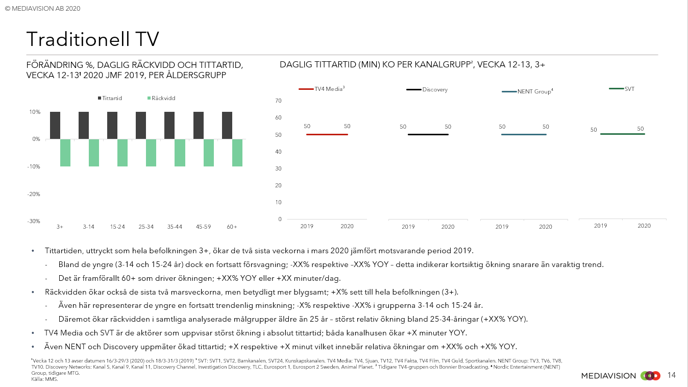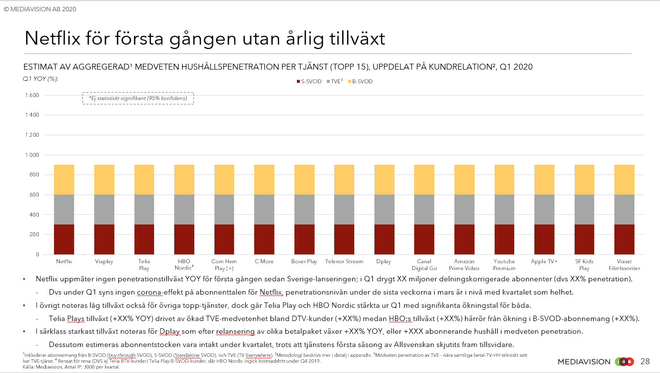 Mediavisions löpande analyser inom TV & Streaming baseras på ca 20 000 riksrepresentativa intervjuer med 15–74-åringar i Norden varje år. Till detta adderas data från en rad bolagsrapporter, publika och branschspecifika källor. Den svenska analysen publiceras kvartalsvis, den nordiska halvårsvis.