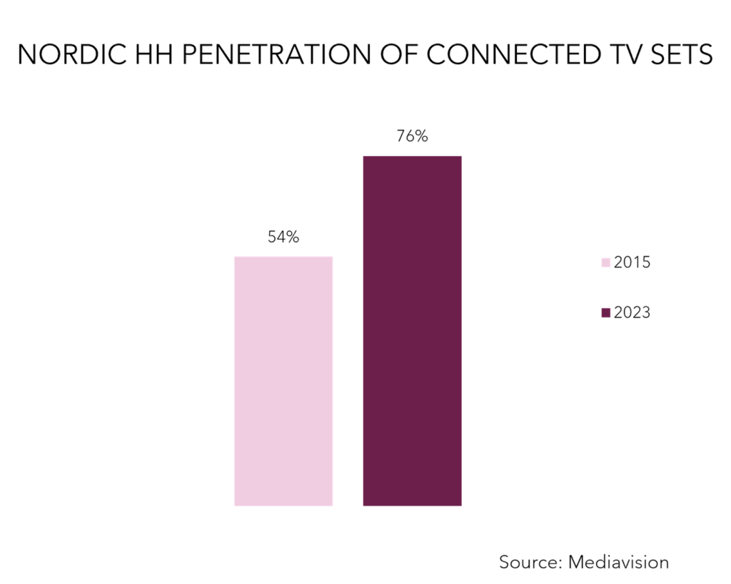 As TV viewing has moved to streaming, the demand for internet connected TVs has grown rapidly into today being the norm. As many as 75 percent of the Nordic households now have a TV set connected to the internet. Most TV manufacturers are also moving closer to content, either through own services or through the supply of content from others. This will likely mean further increased competition going forward.